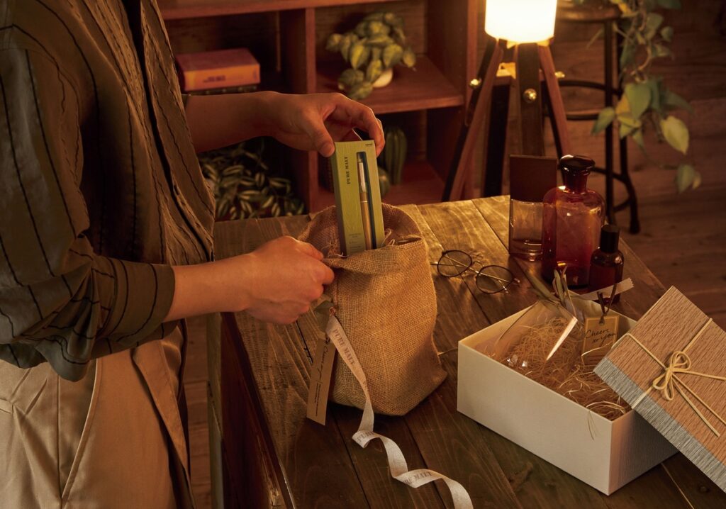 商品のパッケージには、ペン全体が見える窓を付けた紙製パッケージを採用。パッケージはエンボス加工による木目デザインが印象的で、大切な方へのギフトとしてもお使いいただける。