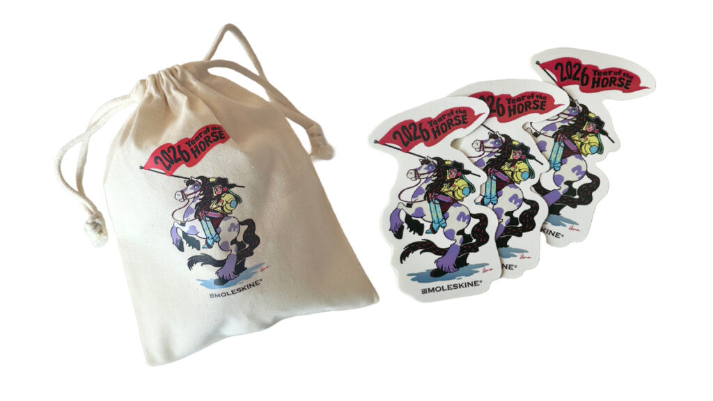 さらに、モレスキンストアにて、新年の午年を記念した巾着とステッカーをプレゼント。イラストレーター鈴木夏菜氏による描き下ろしデザインを採用し、ノートブックや手帳など彩るアイテムとなる。 数量限定につき、なくなり次第終了。