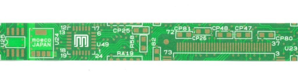 デザイン面では、配線パターン、ICや抵抗、コンデンサなどの電子部品のフットプリントを配置。一部の部品では、部品名のシルクを「moeco JAPAN」に置き換え、別部品ではブランドロゴの「m」を配置し、基板アート雑貨ブランドとして常に意識している遊び心の要素も加えている。