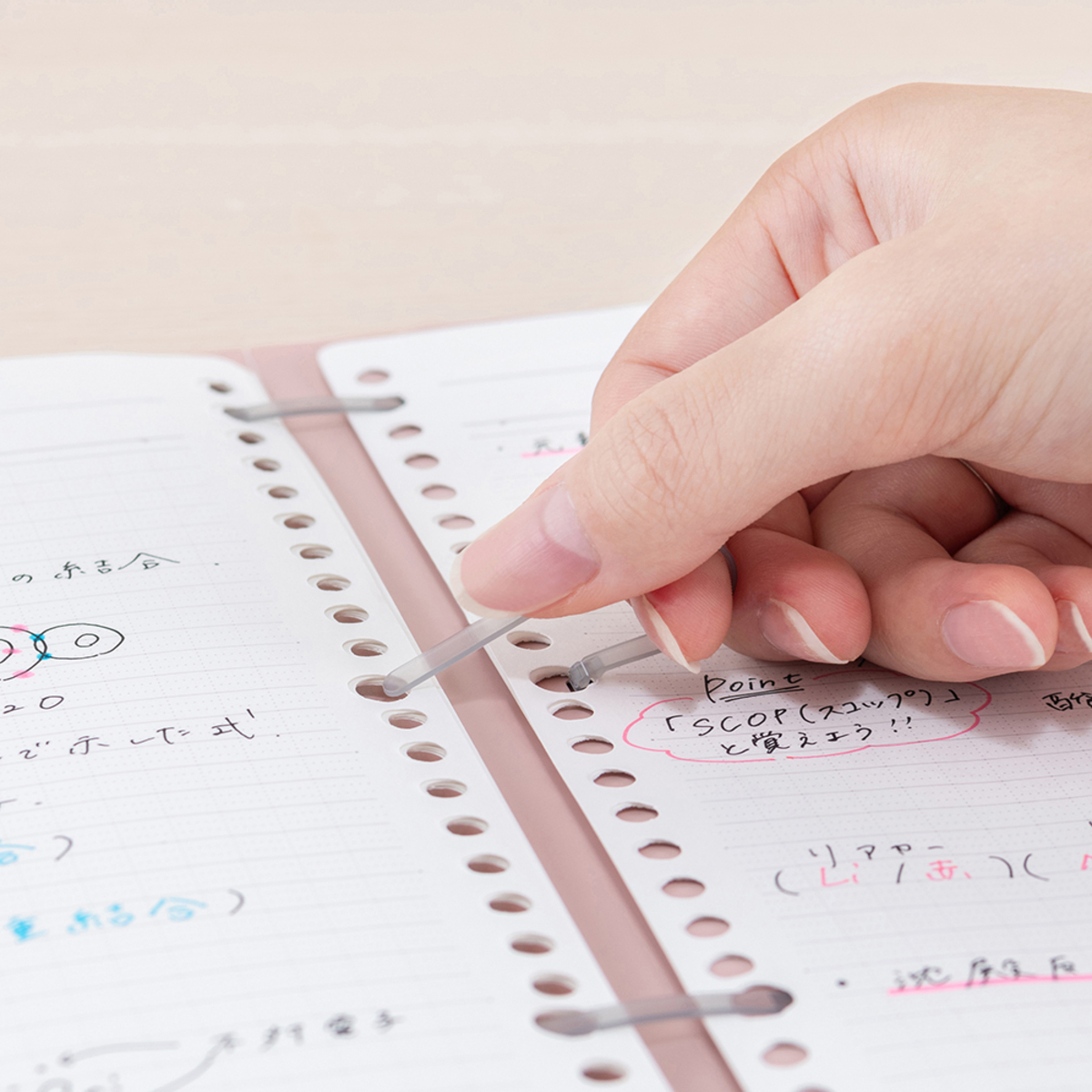 - 筆記時に手に当たっても気にならない独自開発の超薄型綴具「フラットバー」を採用