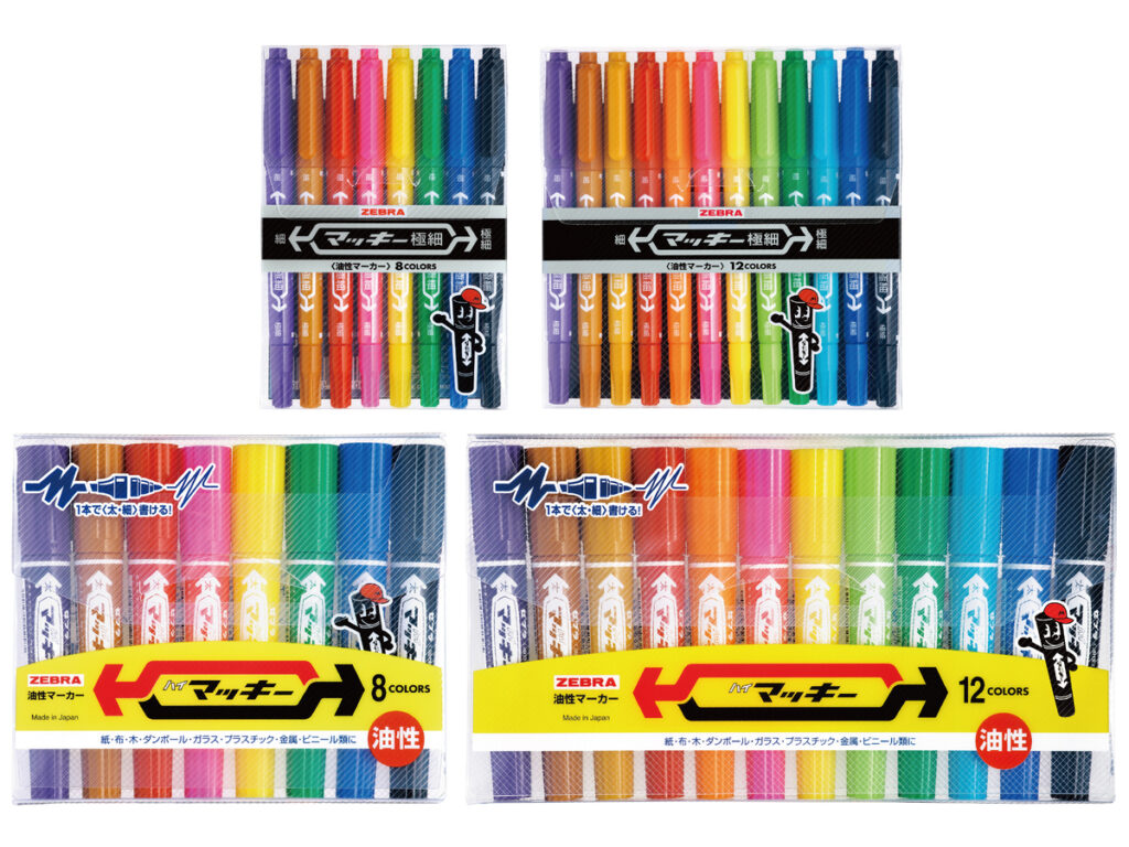 新しいパッケージは、「ハイマッキー」および「マッキー極細」の1本入・3本入・5本入を2026年1月より順次出荷する。8色セット・12色セットについても同年4月より出荷が予定されている。