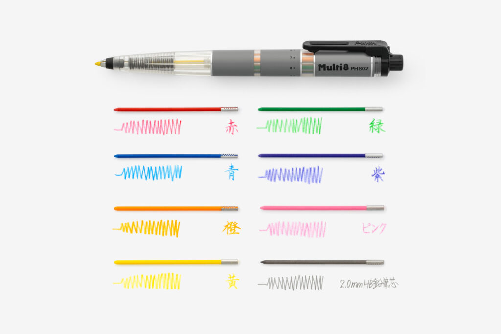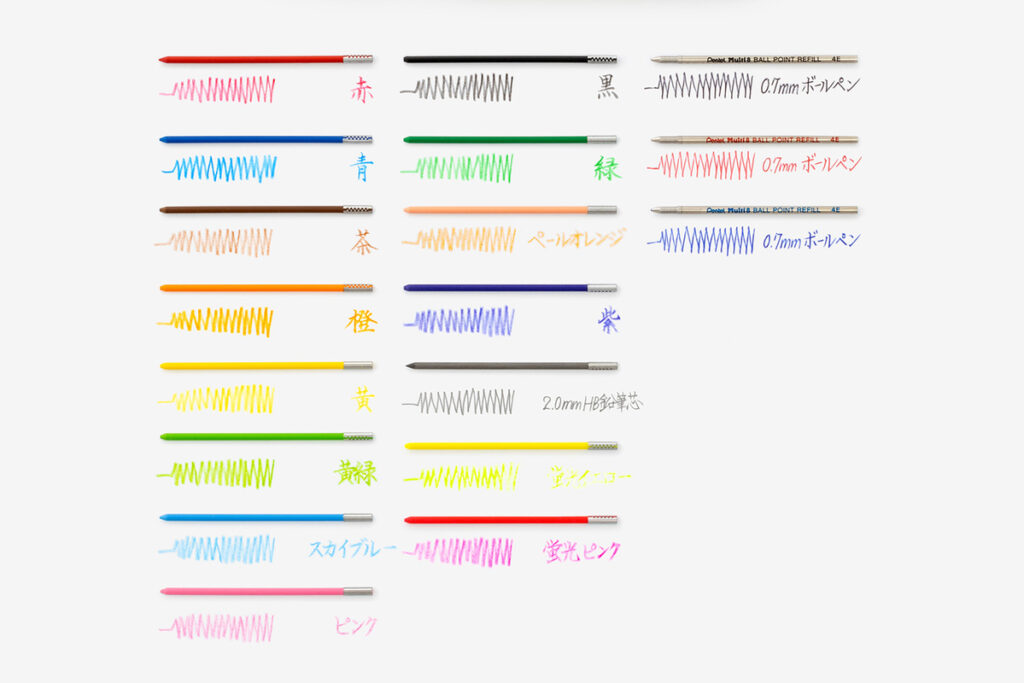 書くものやシーンに合わせて、お好きな芯に入れ替えて、自分だけの1本にカスタマイズすることができる。マルチエイト専用替芯は、蛍光色や鉛筆芯、油性ボールペン芯などを含む、全18種のラインアップだ。