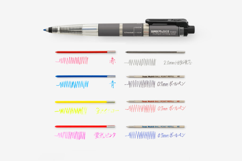 ボディにはホルダーに入れた内蔵芯を選択しやすいよう、番号や色名を記載している。マルチエイトは、内蔵芯を入れ替えて自分だけの1本にカスタマイズできるよう、スロットナンバーのみのデザインだ。スーパーマルチエイトは、使いたい芯をすぐに見つけて選択できるよう、内蔵芯名を表記している。