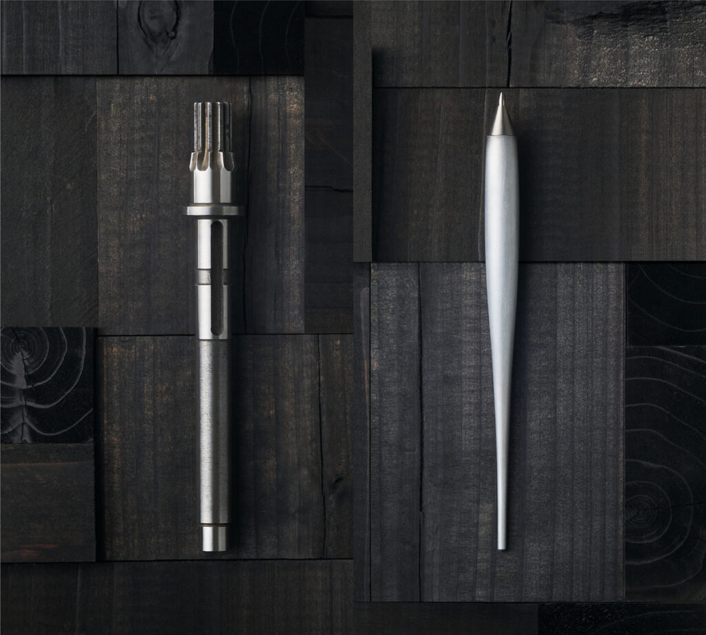 得意とする金属の旋盤加工技術を用い、ステンレスのインゴット(金属の塊)から一つひとつ削り出して製作。G-GOODSプロダクト第一弾の『BALLPOINT PEN(TYPE A)』に精密にフィットするよう設計されており、セットで使うことで、金属の削り出しならではの凛とした佇まいが書斎の空気を引き締める。