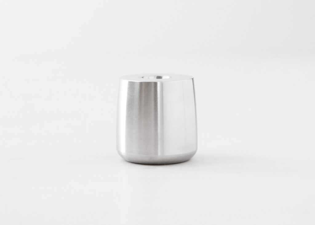 ステンレススチールの塊からNC旋盤で削り出した。3cm四方に収まるコンパクトな佇まいでありながら、金属無垢材ならではの重さを感じられる。ペン立てとしても、ふとした時のペーパーウェイトとしても使える。