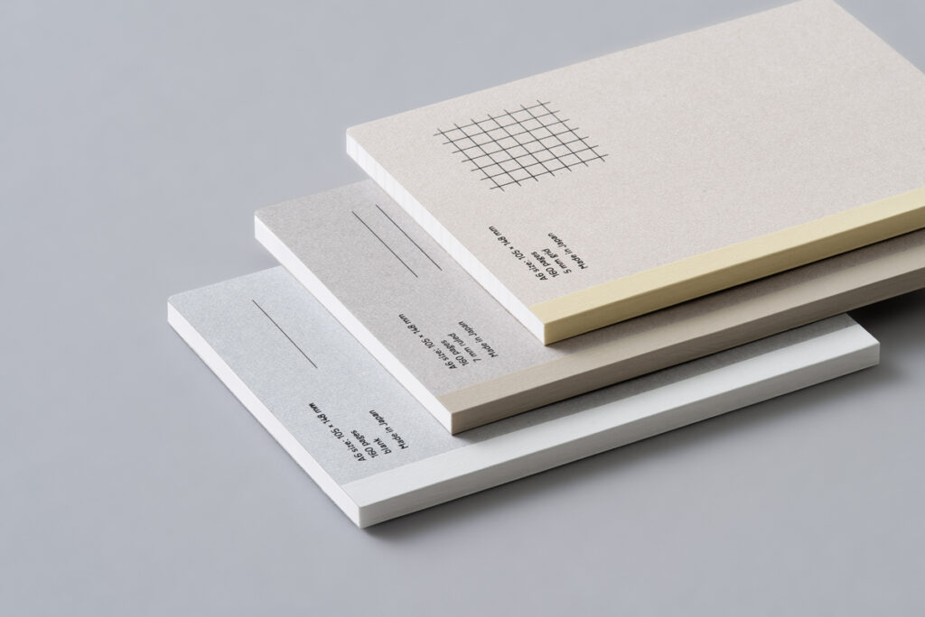 表紙カラーはフォーマット別に3色を展開。方眼罫にはぬくもりを感じさせるイエローグレー、横罫にはクールでニュートラルなグレー、無地には青味を帯びたブルーグレーと、いずれも主張しすぎることなく、書く時間や日常になじむカラーリング。
