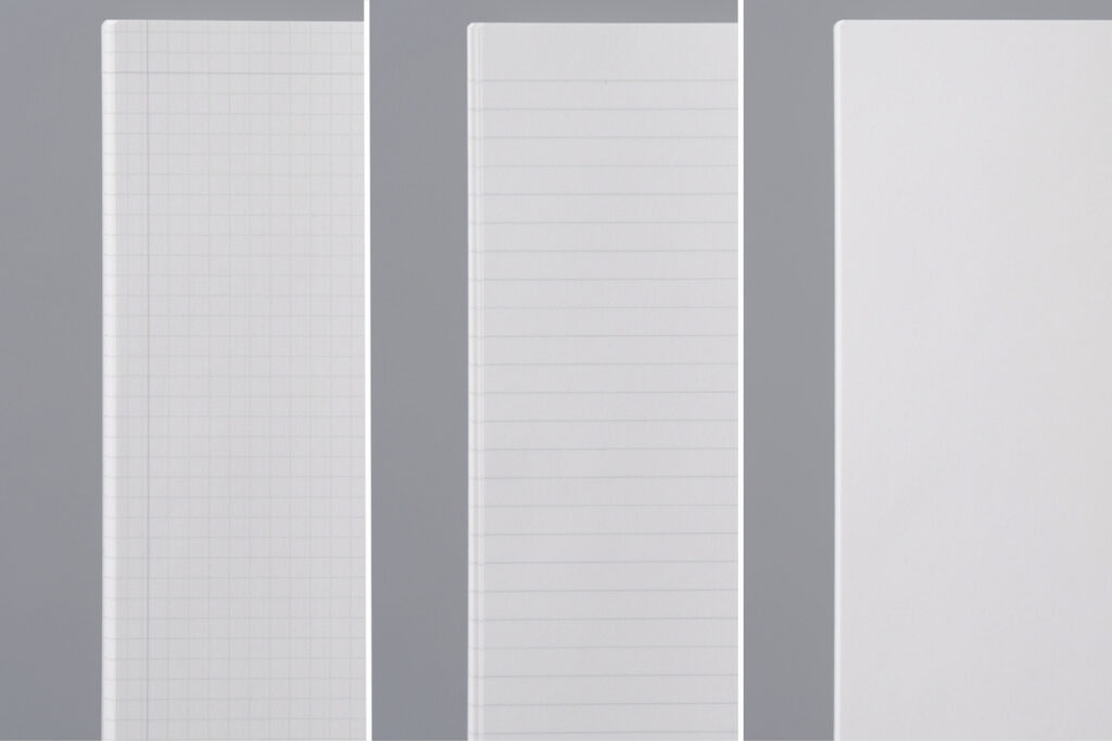 既存シリーズの320ページの半分となる160ページの設計に、表紙にはニュアンスのあるグレーの板紙を採用。薄く軽やかな仕上がりと、知的でミニマルなカバーデザインを両立している。フォーマットは既存シリーズの方眼罫に加えて、横罫・無地の3種類、サイズはA6・A5・A4の3サイズをラインアップしている。