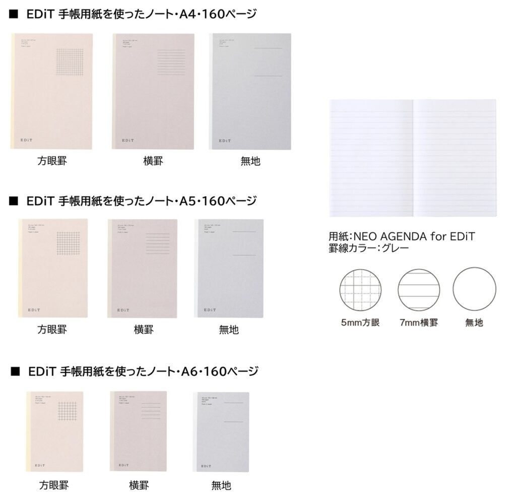 「エディット手帳用紙を使ったノート・160ページ」は、「エディット」1日1ページ手帳のために開発されたオリジナル手帳用紙「ネオ・アジェンダ・フォー・エディット(NEO AGENDA for EDiT)」を採用している。また、既存シリーズのノートからページ数を半分の160ページとし、表紙を紙仕様にすることで、さらに薄く軽やかな使い心地に仕上げた。