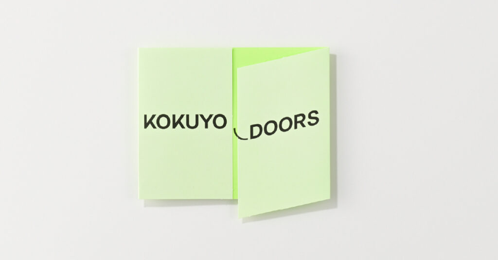 コクヨの好奇心溢れる世界へのドアが開くイメージを表現。ショップカードは実際にドアのようにページを開くことで、中面にワクワクする世界が広がっていることを予感させるようなデザインだ。