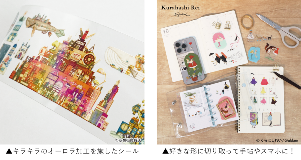イラストをたっぷりと配置したロール型のシートシールだ。シールにはキラキラとしたオーロラ加工を施し、高精細印刷によって各クリエイターの世界観をクリアに表現している。好きな形に切り取って使うことができるので、ノートデコのパーツにも最適だ。