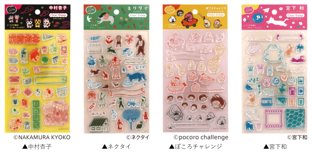 精巧に再現したイラストを、透明な樹脂でできたシート状のスタンプにした。手帳デコに使いやすいミニサイズから大迫力のビッグサイズまで、デコレーションが楽しくなるスタンプが、1シートに30個以上セットされている。文字を書き込めるフレーム型や、文字をかたどったフレーズ系のスタンプもあり、メッセージカードにもお使いいただける。スタンプは台座のアクリルブロックに何度でも貼ったり剥がしたりできるので、スタンプを貼り替えて楽しむことができる。