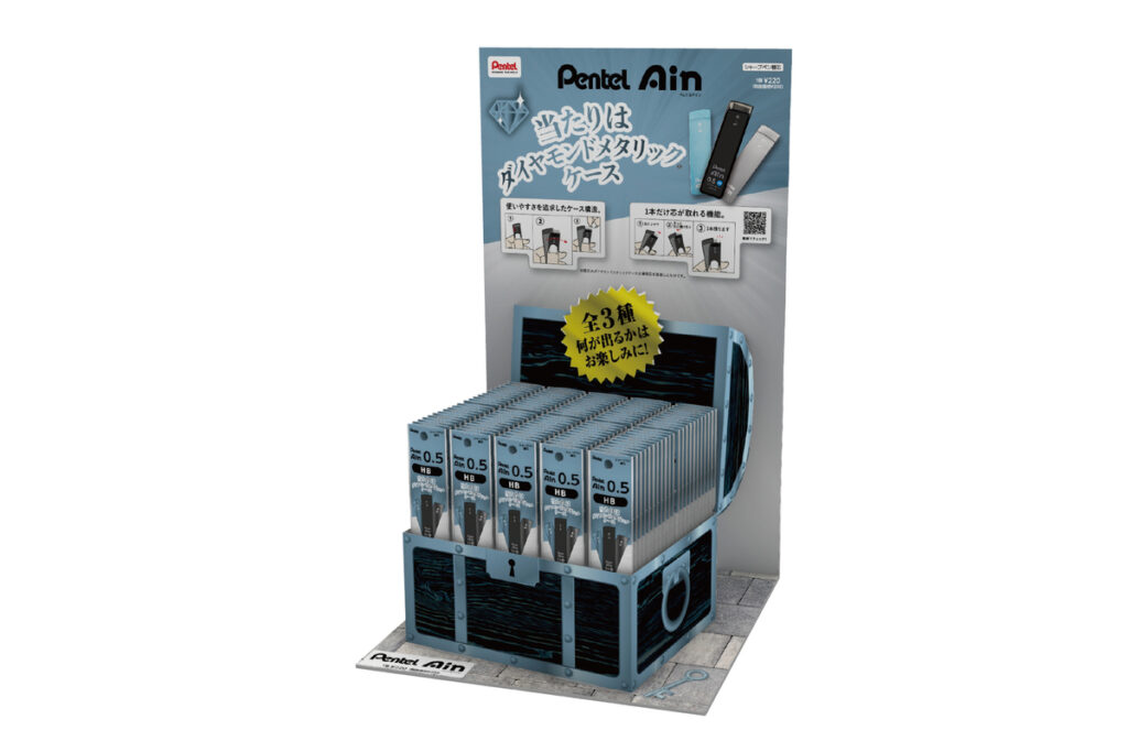 本キャンペーンでは、ブルーダイヤモンドメタリックの限定ケースのPentelAin(0.5/HB)、ダイヤモンドメタリックの限定ケースのPentelAin(0.5/HB)、ブラックのケースのPentelAin(0.5/HB)のいずれかが当たる。