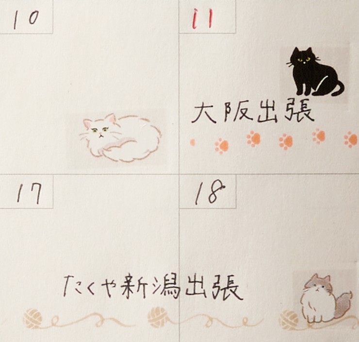 11mm幅には「かお」「うしろすがた」(いずれもインクカラー:ブラック)を展開。上から色を塗って自分の好きなネコにアレンジしてデコレーションが楽しめる遊び心あふれるデザインだ。太幅なので、余白部分を彩るのにもおすすめだ。