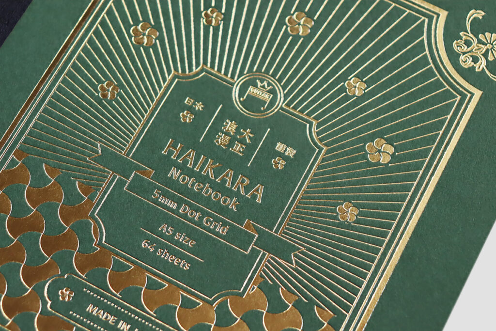 大正時代の情緒をまとうレトロモダンなデザインに金箔印刷をあしらい、高級感のある仕上がりに。 書く時間をより特別なものにしてくれる、こだわりの詰まったノートとなっている。