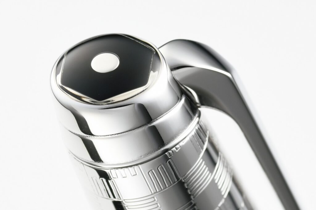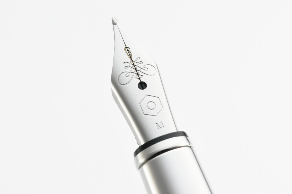 自社製ペン先は、紙に触れた時の手に伝わる心地良さを追求した。18金にロジウムコートを施し、ヘキサゴンマークを刻印している。