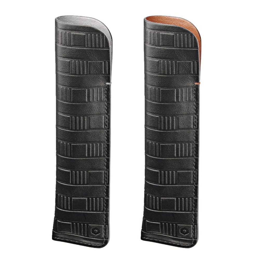 レザーペンシースが付属したギフトセットとして販売中。ペンシースはなめらかな質感の黒い牛革に、エンボス加工でチェッカー模様が施されたシックなビジュアルだ。