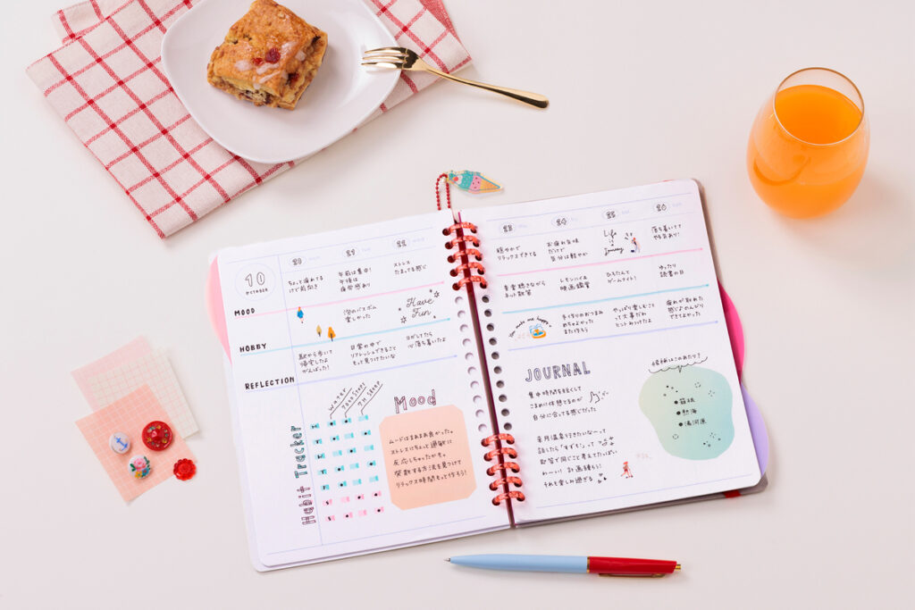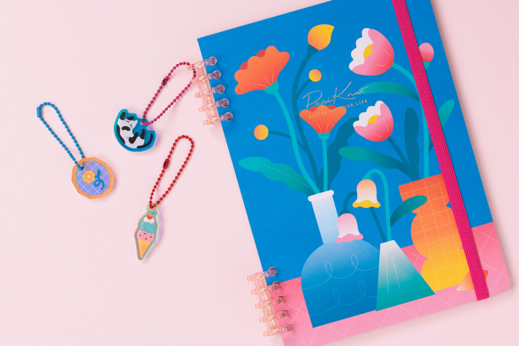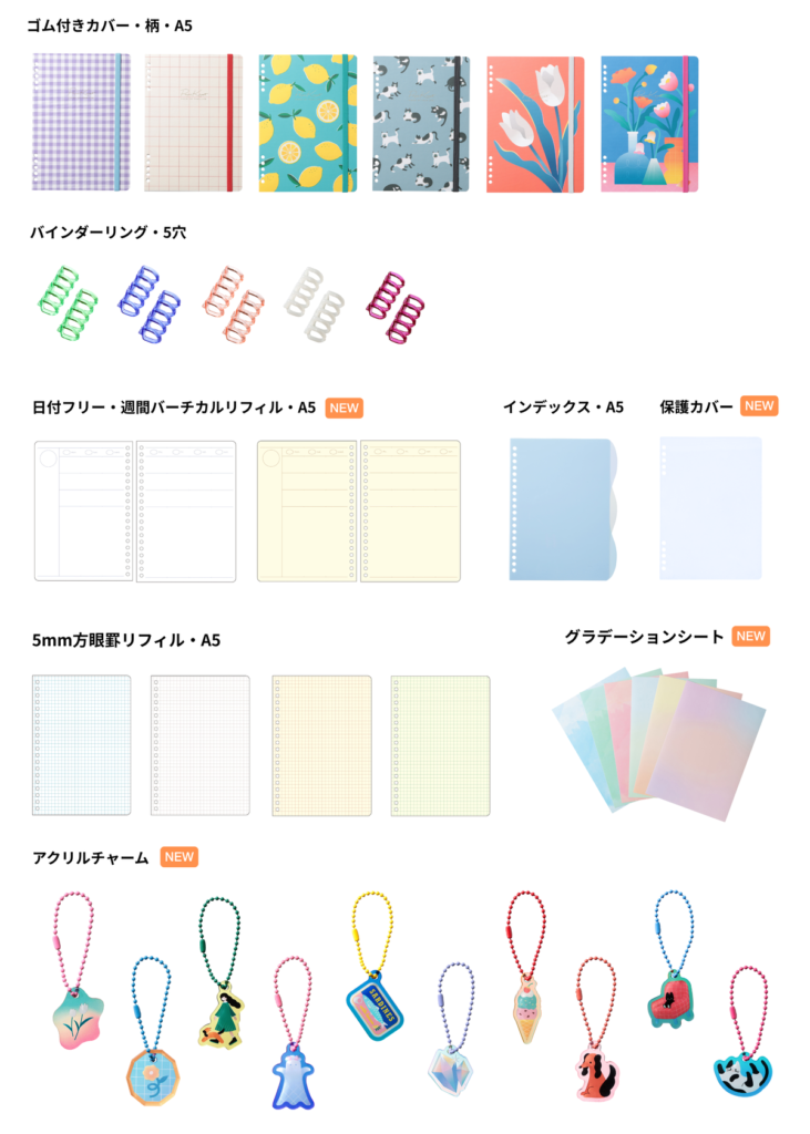 今回のコレクションでは、ノートを開くたびに気分が上がるポップな新柄カバーと、コーディネートのアクセントになるボールチェーン付きの「アクリルチャーム」が仲間入り。カバーにプラスすることで印象が変わり、“わたしだけ”の 1 冊づくりがさらに自由に広がる。