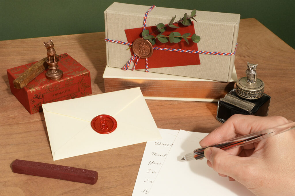 シーリングスタンプは、本来の手紙の封蝋としての用途はもちろん、ラッピングやメッセージカード、席札などのクラフトにも活躍する。