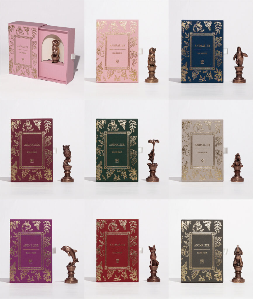 シリーズ名の由来となった「アニマリエ (animalier)」とは、主に19世紀に、動物をリアルに描写する技術を持った芸術家の一群のこと。このシーリングスタンプもその名にふさわしく動物たちの精緻な表現にこだわって作りあげている。