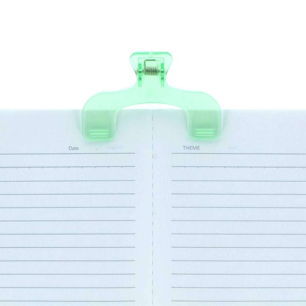 くるっとペン型に畳むことができるブッククリップだ。左右のクリップが独立してそれぞれ動くため、異なる厚みでもフィットする。